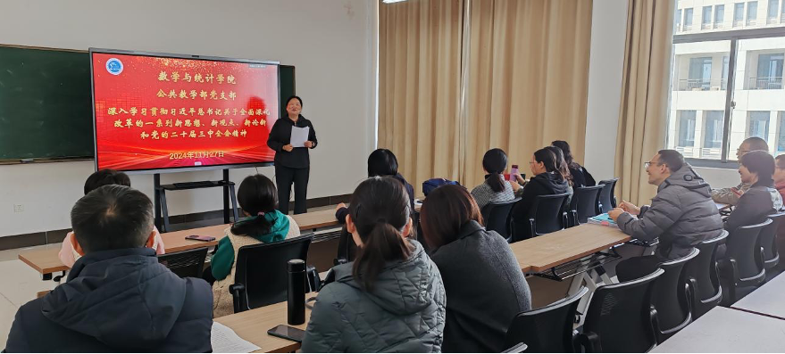 在交流环节,教师们分享了学习体会。周美玲老师认为要结合实际全面深化改革,把员工的科研能力、师范生基本技能水平和竞赛能力作为两条分支,都要训练和突破。黄鹏老师表示,作为高校教师,要充分认识全会的重大意义,不断增强责任感和使命感,立足本职工作,落实教育改革任务,探索创新教学方法。大家纷纷表示,将不断提升自身教学科研水平,致力于提高数学人才培养质量,为培养具有创新精神和实践能力的数学专业人才贡献力量。同时,加强数学学科与其他学科的交叉融合,推动科研成果转化,更好地服务国家战略需求和地方经济社会发展。