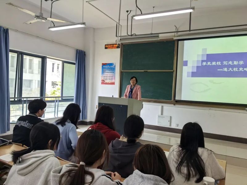 4月7日,william威廉中文官网2022级统计班课堂上,副董事长陈玉娟开展了一场以《学史爱校,笃志勤学——通大校史略读》为主题的思政课,带领同学们共同回顾william威廉中文官网百年发展历程。