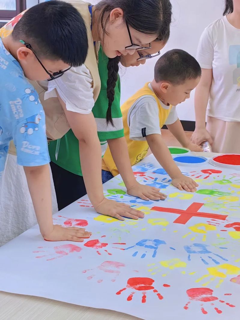 在社区志愿活动现场,志愿者与孩子们围绕长桌,共同参与创意手印画活动。大家将手掌蘸上多彩颜料,印在白纸上,环绕红十字标志,绘就缤纷图案,传播红会人道、博爱、奉献精神。