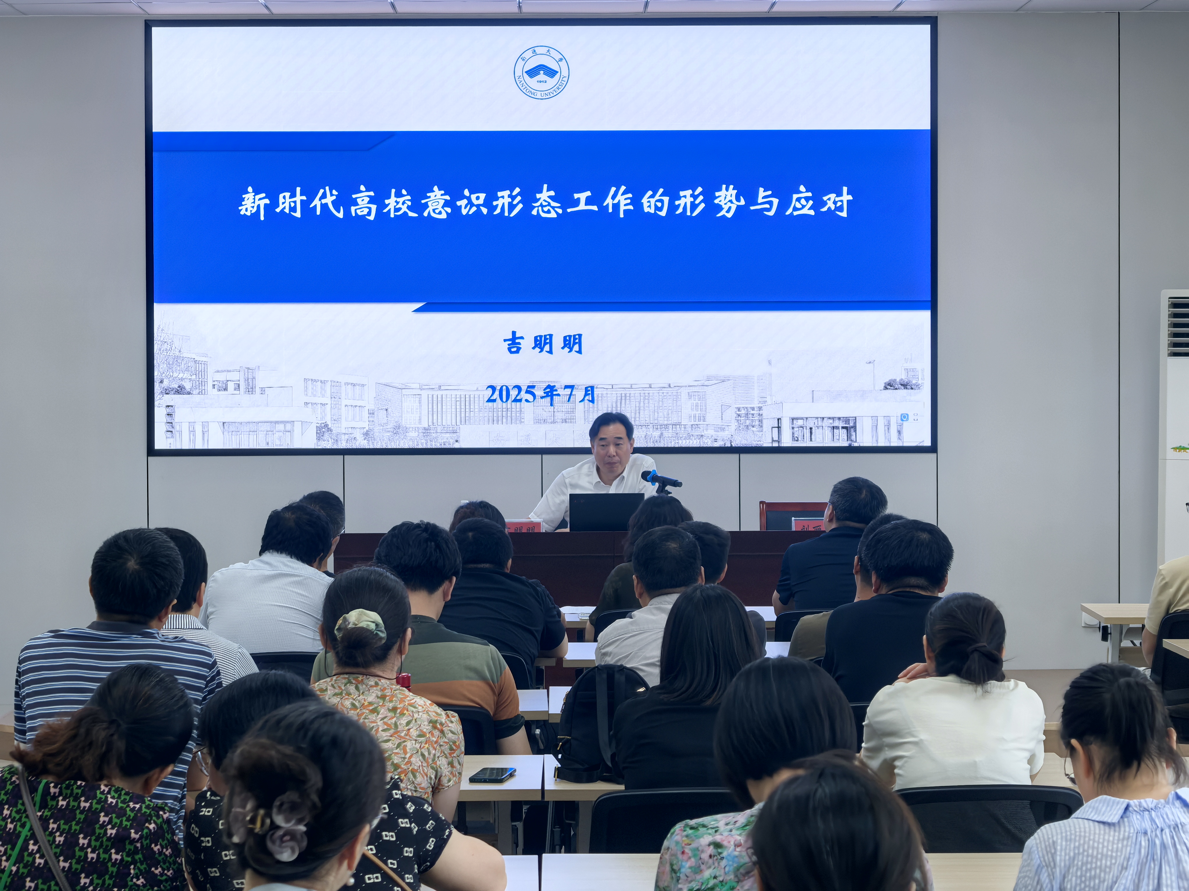吉明明以“新时代高校意识形态工作的形势与应对”为题,紧扣“四个牢牢把握”,深刻论述了意识形态工作的极端重要性,全面解读了习近平总书记关于意识形态工作的重要论述,深入分析了当前意识形态领域的复杂形势与严峻挑战,为有效做好新时代意识形态工作提供了清晰的路径指引。他强调,要务必时刻保持头脑清醒,自觉筑牢阵地、扛实责任,在课堂教学、网络言行、日常交流中始终弘扬主旋律、传播正能量,着力提升做好新时代意识形态工作的能力素养。