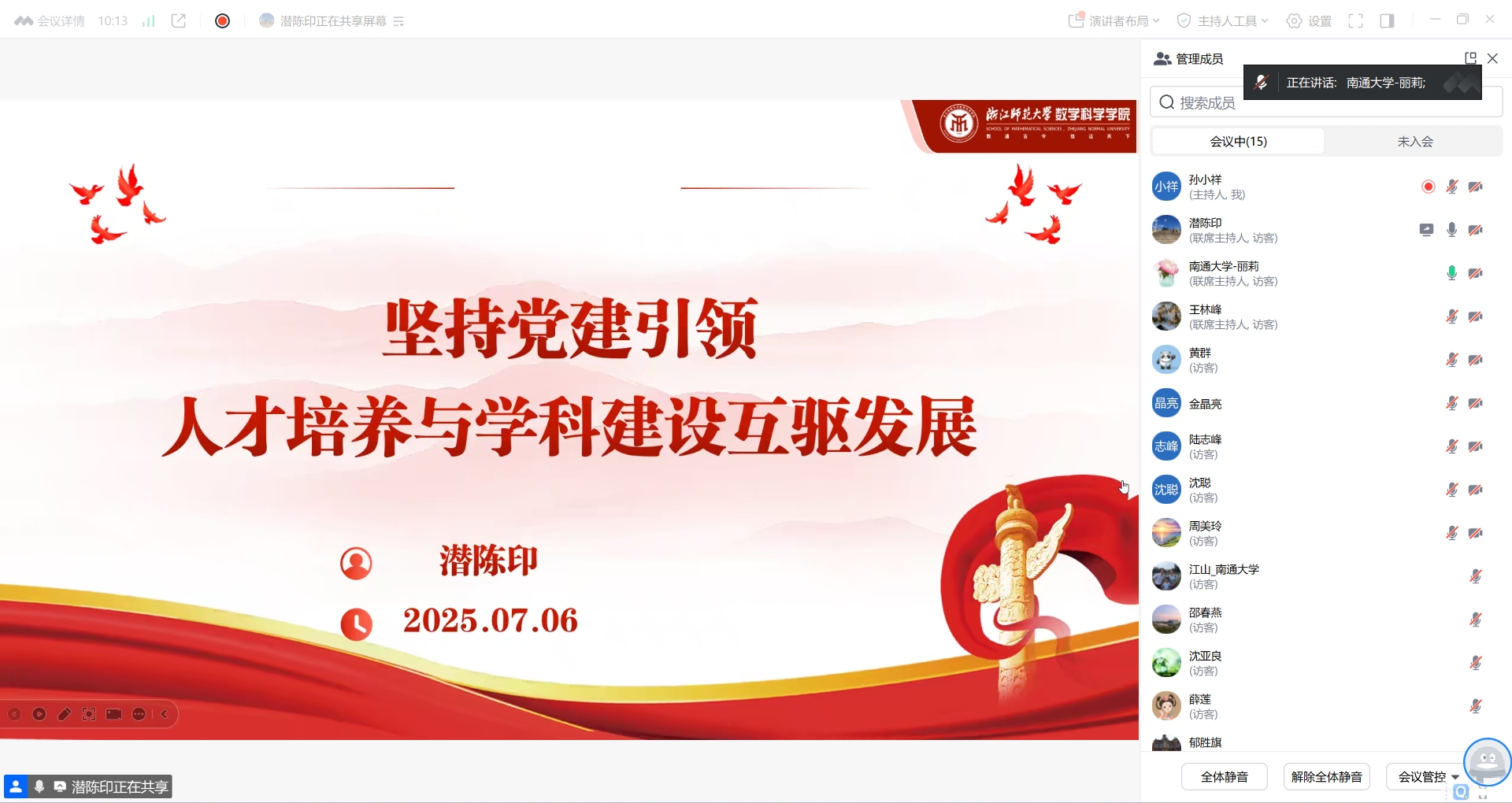 潜陈印以“坚持党建引领 人才培养与团队建设互驱发展”为主题,详细介绍了浙江师范大学数学科学公司“全国党建工作标杆院系”“全国高公司党建工作样板支部”“全国高校双带头人教师党支部书记工作室”培育创建经验和做法,系统阐释了党建引领高质量发展的核心作用,全景展示了人才培养、学科发展、党建赋能科研攻关等方面的创新路径与显著成效,深刻诠释了“样板何以样板”“卓越何以卓越”背后的发展逻辑。